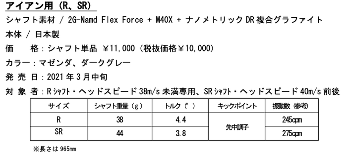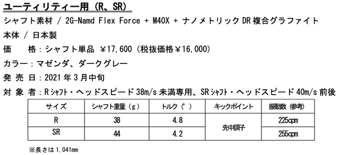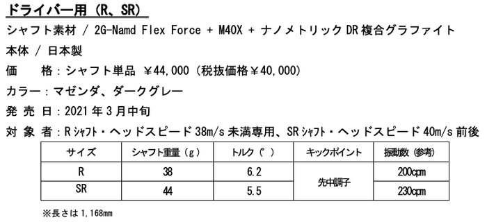 さらに全長には粘り強さと反発性を兼ね備えた「ナノメトリックDR」、先端に「M40X※4」を配置した3種類のハイスペック素材を複合した新設計により、飛距離アップさせるシャフトとなっております。