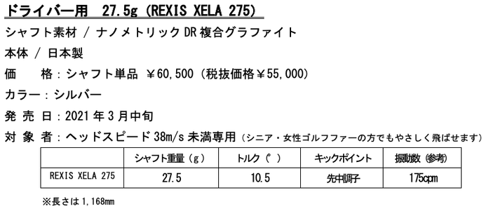 世界最軽量※1を更新!わずか27.5gのゴルフシャフト 驚きの軽さと高強度・高反発を両立した NEW「REXIS XELA(レクシス キセラ)」 2021年3月中旬より発売