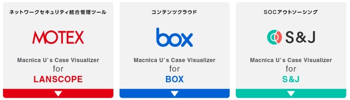 MUCVが提供する分析可能なアプリケーションの第1弾として、エンドポイントセキュリティを提供するエムオーテックス社の「LANSCOPE」と連携した「MUCV for LANSCOPE」、コンテンツクラウド「BOX」と連携した「MUCV for Box」、弊社関係会社であるS&J社と連携した「MUCV for SOC」の3製品との連携サービスを提供いたします。