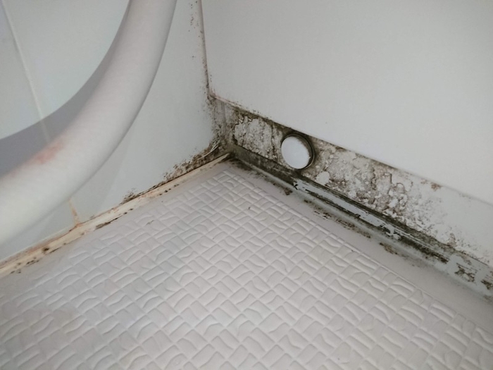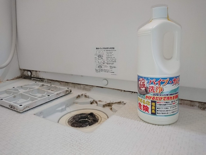 排水口に洗浄剤をかける、ゴム手袋で壁面のカビに塗る