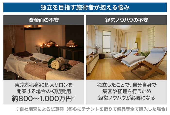 このようなことから、技術もあり、多くの顧客を抱えているのに、環境を整えられず雇われの形を継続している施術者も多くいると思います。