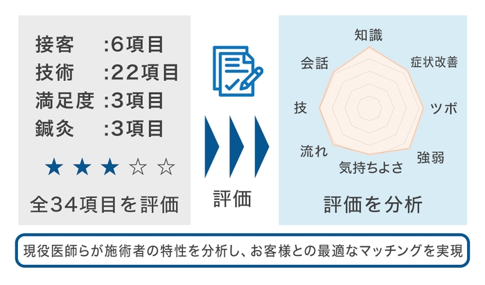 店舗に所属する施術者は全員、国家資格であるあん摩マッサージ指圧師の資格または、はり師・きゅう師の資格を保有し、その上でさらに、医師と専門家による34項目の厳しい独自評価基準をクリアした施術者のみが所属しています。