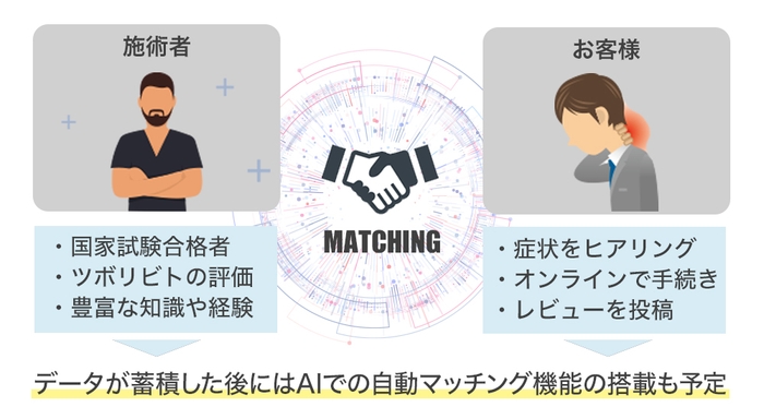 その他にも、お客様満足度向上のために施術者のレビューを専任する「ツボリビト」を採用し、施術する側と受ける側の両面から適正な評価を付けます。さらに、2022年度中にはAIを活用したレビューシステムも採用する予定で、お客様の悩みに合わせて本当に適した施術者を選定することが可能になると考えています。