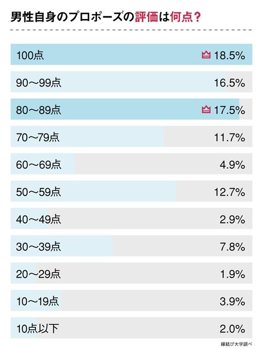 「自身のプロポーズを採点すると何点か?」という質問で、一番多かったのは100点満点(18.5%)という回答でした。次に多かったのは80点台(17.5%)、3番目は90点台(16.5%)です。ボリュームゾーンで見ると、71~90点以下が最も多くなりました。回答者全員の平均は、69.6点とやや低めの結果でした。
