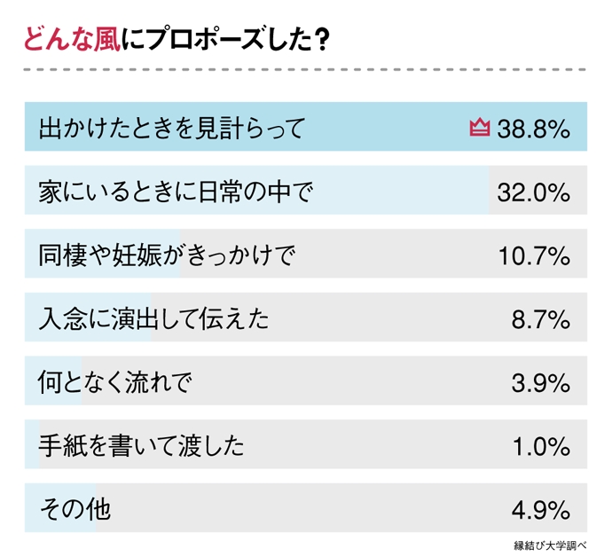 プロポーズのタイミングは「2人で出かけた時に伝えた」が38.8%で最多