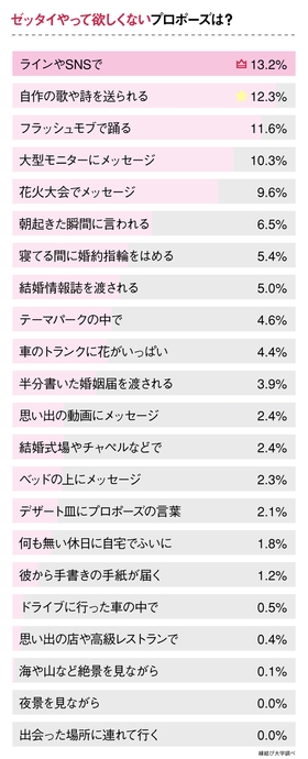逆に「ゼッタイにやって欲しくない」プロポーズについても調査しました。最も多かったのは「ラインやSNSでプロポーズの言葉が送られてくる」でした。「自作の歌や詩を送られる」も女性からは不評です。