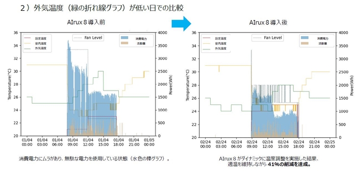2)外気温度(緑の折れ線グラフ)が低い日での比較