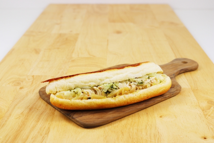 食欲の落ちる暑い夏でもおいしくお召し上がりいただける調理パンをお届けしたいと思い「パニーニ(桜島どり&バジル)」を開発いたしました。鹿児島県産の銘柄どり「桜島どり」を選び、脂身の少ないむね肉をオリーブオイル・白ワインビネガーでマリネしました。後味がさわやかなジェノベーゼソースを合わせることで、さっぱりとお召し上がりいただくことができます。