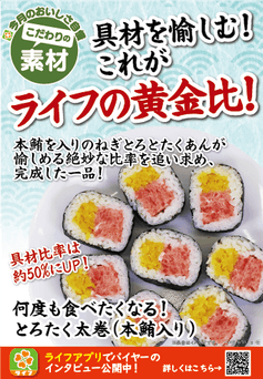 “おいしい” “ワクワク” “ハッピー” をお届けするライフコーポレーションは、惣菜とインストアベーカリー“小麦の郷”の「おいしさ自慢」商品として、「何度も食べたくなる!とろたく太巻(本鮪入り)」と「パニーニ(桜島どり&バジル)」を8月1日(木)に発売いたしました。