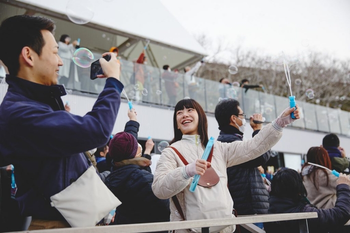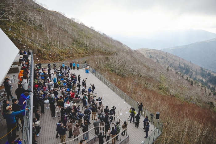 本セレモニーは、ダイナミックな雲海を間近で鑑賞できる「雲海テラス」の営業開始日に、多くの方々が雲海に出会えますようにという願いを込めて、毎年実施しています。本日は540名のお客さまが来場し、展望デッキからシャボン玉と雲に見立てた白い泡を飛ばして空を彩りました。同時に、未来を開くという意味がある「シャンパンオープン」を行い、お客さまにシャンパンと雲をモチーフにした初日限定の「雲まんじゅう」を楽しんでいただきました。