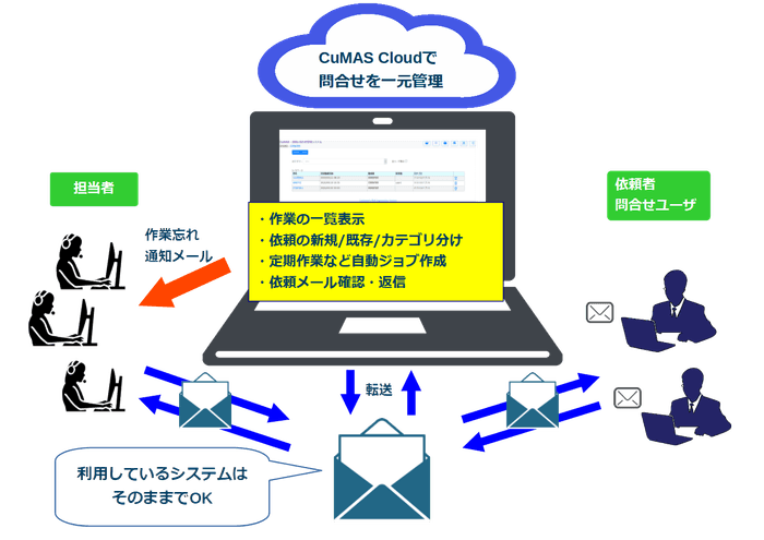 本サービスは、問い合わせメールを自動的にシステムへ登録し、WEBブラウザから問い合わせの進捗状況や担当者を管理できるようにするものです。これにより、問い合わせの対応漏れを防ぎ、業務効率を改善できます。