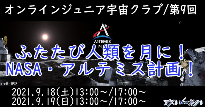株式会社アストロコネクト(本社:神奈川県川崎市多摩区 代表取締役:荒井大作、以下アストロコネクト)は小学生を対象にした「オンライン ジュニア宇宙クラブ第9回」を9月18日(土)/19日(日)にオンラインで開催いたします。今回のテーマは「再び人類を月に!アルテミス計画」と題して、今後の月面開発に迫ります!