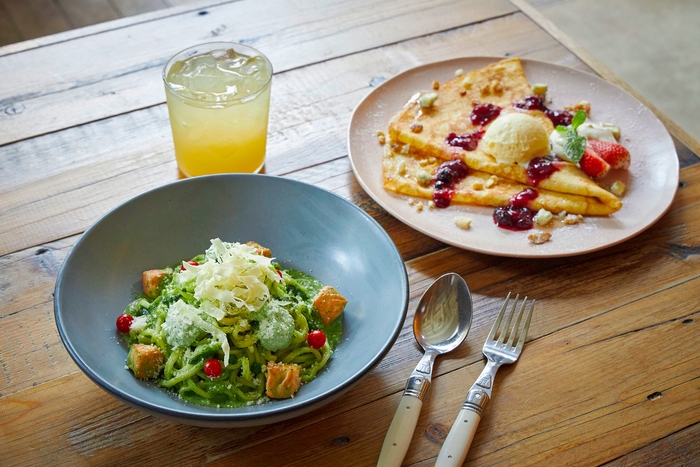 4種のチーズほうれん草が入った特製グリーンソースに、鎌倉花チーズ、ほうれん草リコッタ、マクロトマトでコクと彩りを添えたクリスマス限定のスペシャルパスタ。