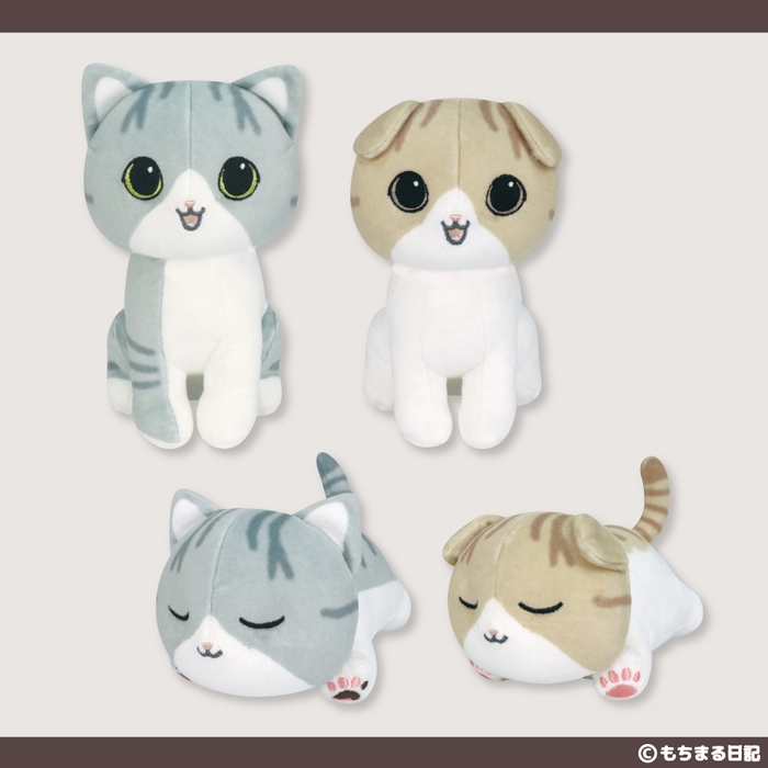 『おすましポーズ』と『ごろりんポーズ』をした、もちまる・はなまるのぬいぐるみです。