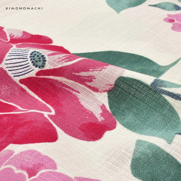 アイボリーの地にピンク色と濃ピンク色、赤みのピンク色、白にピンク色の絞りの入った椿の花。青磁色と緑の葉。ところどころかすれたような色合いと、輪郭線のない表現がレトロでかわいらしい雰囲気です。