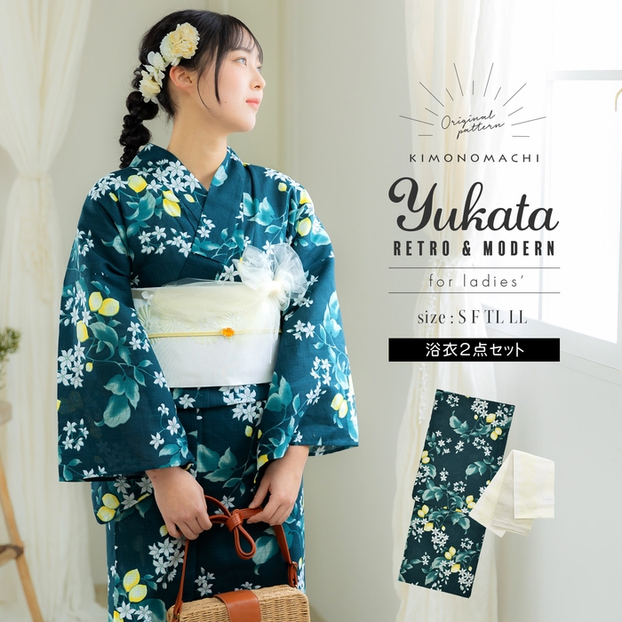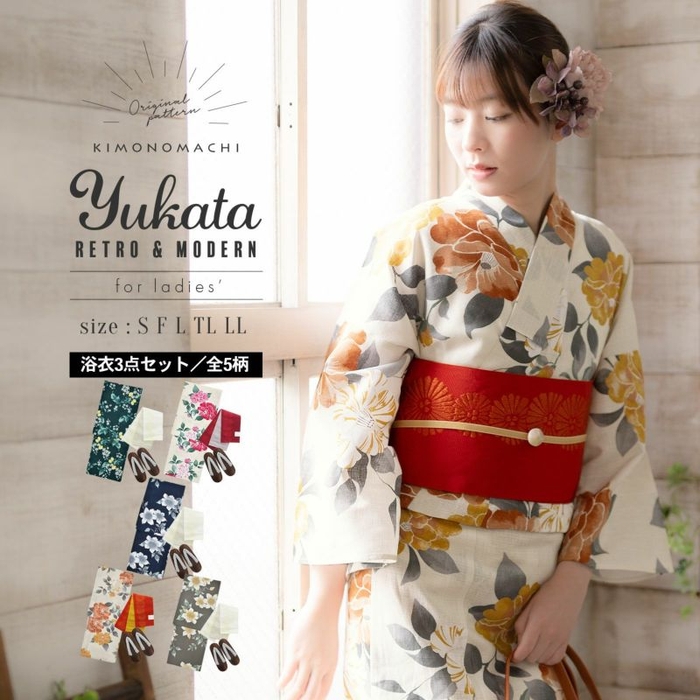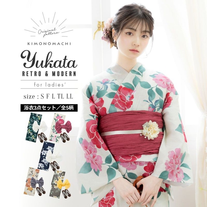 これらの浴衣と半幅帯/兵児帯をメインに、S/F/TL/LLサイズは浴衣+帯2点セット、浴衣+帯+下駄の3点セットの他、浴衣+帯+下駄をご用意中。さらに、インナーや着付け小物も入った8点フルセットも後日リリースを予定しております。