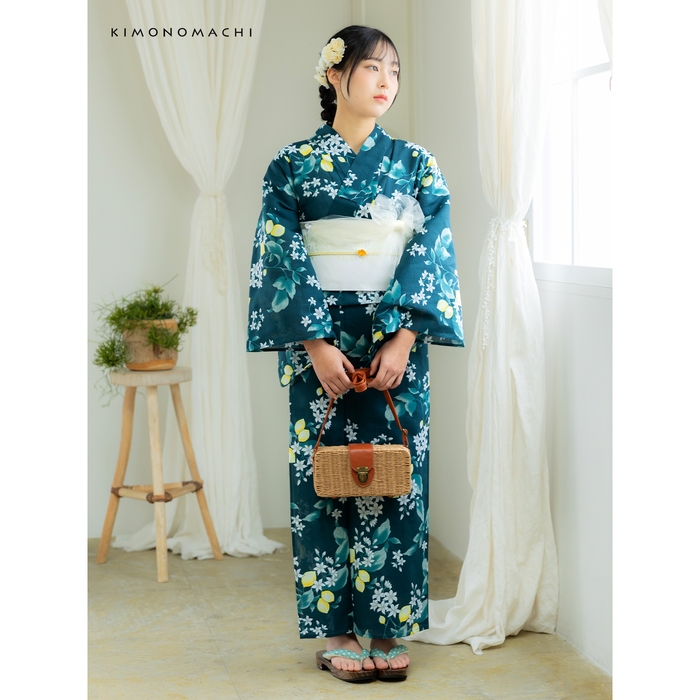 甘くなりすぎないデザインが大人の女性に人気の「檸檬」の浴衣。既存の色はナチュラルな雰囲気のサンドベージュ、トレンドのくすみカラーのブルーグレー。今回、新たに加わったのは人気色のクロムグリーンです。深い緑の地に明るい檸檬が清新な印象です。