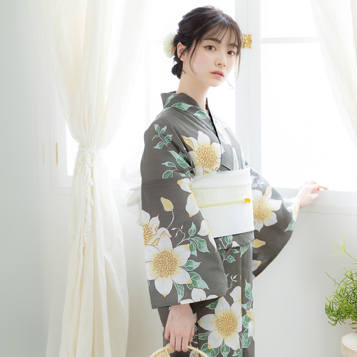 わずかに緑みのグレーの地。茶色の輪郭線で表された生成り色に淡い黄色のクレマチスの花。白い輪郭線にくすんだ緑と薄緑の葉。レトロな柄行と現代的なカラーが魅力の浴衣です。