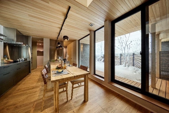 デザイン×性能×保証×中間領域をご提案。雪深い地域だからこそ屋根付きのデッキスペースがアウトドアリビングとして春夏秋冬、全ての季節で重宝。吹き抜けを介して繋がる空間が面積ではなく体積で考える空間をご提案します。また、サンコーホームオリジナルシステム「全館冷暖房ダブル空気清浄システム」の搭載により広い空間で快適にお住まいいただけます。