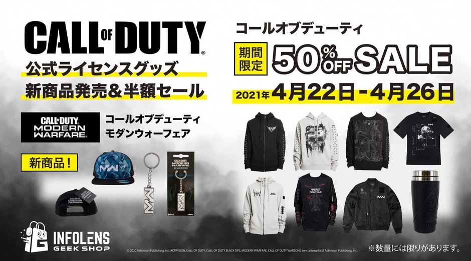 ゲーム関連商品を輸入販売するインフォレンズ株式会社(本社:東京都中央区、代表取締役CEO:安川 洋)は、同社が運営するオンラインショップ「INFOLENS GEEK SHOP」にて『Call of Duty』(コールオブデューティ)の公式ライセンスグッズの新商品発売と定番商品が半額となるキャンペーンセールを2021年4月22日(木)から26日(月)の5日間開催することを発表いたします。