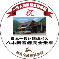八木新宮特急バスは、全長169.9km、168停留所を経由し、高速道路を使わない路線では日本一の走行距離を誇る路線バスとして運行してまいりました。