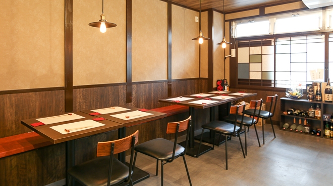 テーブルやカウンター、ドア、柱、壁なども濃いブラウン系で統一されているため、落ち着いた店内での食事が楽しめます。和食一筋の店主による料理風景を見ながら食事ができるカウンター席は、常連さんに人気の場所です。