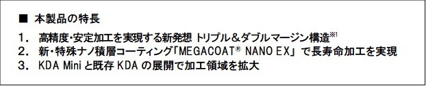 「KDA Mini」は、独自のトリプル&ダブルマージン構造※1と、新コーティング「MEGACOAT(R) NANO EX」(メガコート ナノ イーエックス)を採用したφ1.0~2.9mmの穴あけ加工用ソリッドドリルで、以下の特長があります。