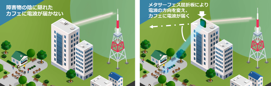 従来型のメタサーフェス反射板は、反射板より手前側に、電波の進行方向に対して大きな角度で曲げる場合には有利ですが、向こう側に小さな角度で曲げる場合には向きません。それに対しメタサーフェス屈折板は、小さな角度で曲げる場合に有利で、障害物を回避するような使い方に向いています。反射板に加えて今回当社が開発したメタサーフェス屈折板を用いることで、電波を曲げる範囲を拡大し、 5Gサービスエリアをさらに拡大することが可能となります。