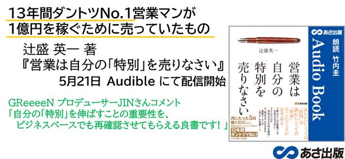 株式会社あさ出版(代表取締役:田賀井弘毅、所在地:東京都豊島区)は、世界最大級のオーディオブック及び音声コンテンツ制作・配信サービスであるAmazon Audible(以下オーディブル)にて、辻󠄀盛 英一 著『営業は自分の「特別」を売りなさい』( https://amzn.to/3MyMXBO )のオーディオブックの配信を2022年5月21日に開始いたします。