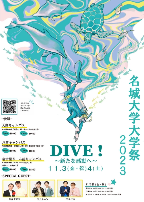 今年のテーマ「Dive! ~新たな感動へ~ 私たちの経験したことのない新たな大学祭へ飛び込もう!」からはコロナ禍前の活気を取り戻し、新たな世界へ飛び込んでいこうという思いを、さらにロゴには3つのキャンパスのつながりをより意識した大学祭との思いを込めています。活気あふれる「名城大学祭2023」にぜひ、お越しください。