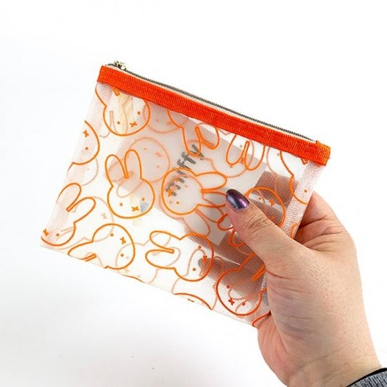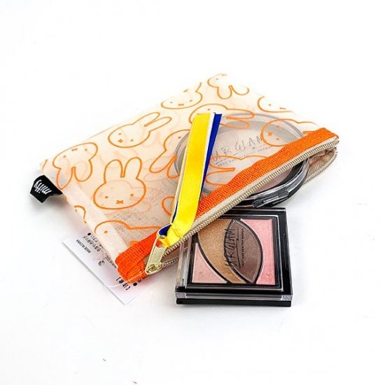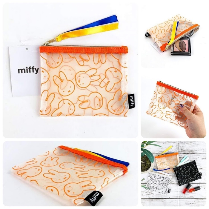 ミッフィーの顔だらけポーチ。青と黄色のリボンが本体のオレンジ色とあわさって元気になれそう♪