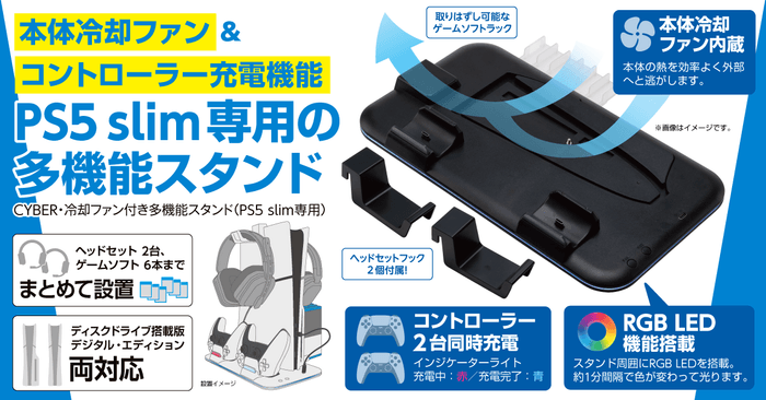 冷却ファン&コントローラー充電機能搭載!本体+コントローラー+ヘッドセット+ゲームソフトを まとめて設置できるPS5 slim専用多機能スタンドが新登場