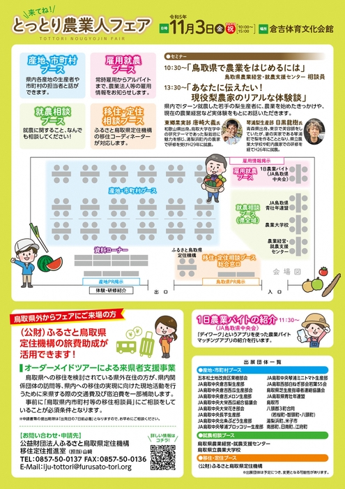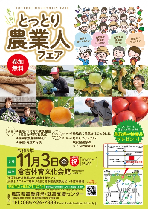 県内農業の担い手不足や、各産地や農地の維持が課題となる中、独立就農、雇用就農、アルバイト等、鳥取県で農業を始めたい!という方を対象に倉吉市で「とっとり農業人フェア」を開催します。県内各産地の生産者や市町村の担当者等が一同に集まり、就農までの道筋についての相談や各産地のリアルな情報を提供します。