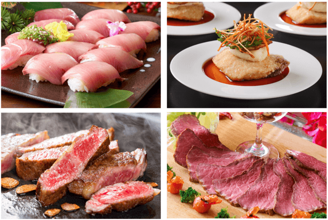 下段左・右:牛ステーキとローストビーフ。ご馳走お肉メニューを欲張りに、2種類同時にご堪能ください。
