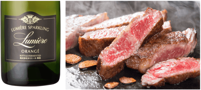 株式会社ルミエールのスパークリングワインは、瓶内2次発酵の後、さらに1年瓶内熟成させたまろやかな味わいと華やかなオレンジ色が特長です。お薦めのペアリングは、ライブキッチンから焼きたて熱々でご提供するサーロインステーキ。ワインの特徴をより感じられるように、お塩を付けてシンプルにお召し上がりください。