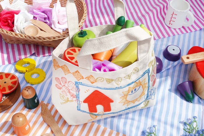 おうち型フェルトやステンシルシートなどのキットを使ってオリジナルエコバッグをつくろう。