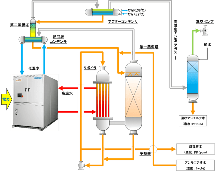 熱回収コンデンサ内でアンモニアを含むベーパー全量が凝縮すると、露点降下を起こし、ヒートポンプの加熱COP低下を招きます。そこで、第二蒸留塔を設け、熱回収コンデンサで分縮操作することにより、アンモニアを第二蒸留塔でもさらに蒸留することにしました。第二蒸留塔はリボイラを用いず、余剰熱だけで稼働するため、熱効率を向上させることに成功しました。