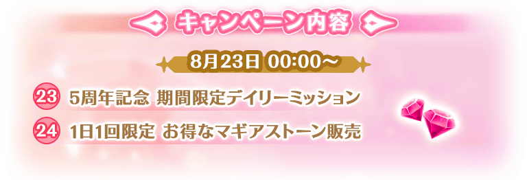 『5周年記念 選べる★4魔法少女ピックアップガチャ』と『5周年記念 選べる★4メモリアセレクションガチャ』をそれぞれ毎日1回限定で「10連ピックアップガチャ」が無料で引けます。