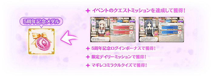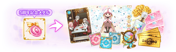 「5周年記念メダル」は、限定メモリア「もしもの、ある日」をはじめ「10連ガチャチケット」「5周年交換チケット」「感情の欠片セット」などの貴重なアイテムと交換できます。