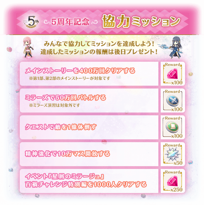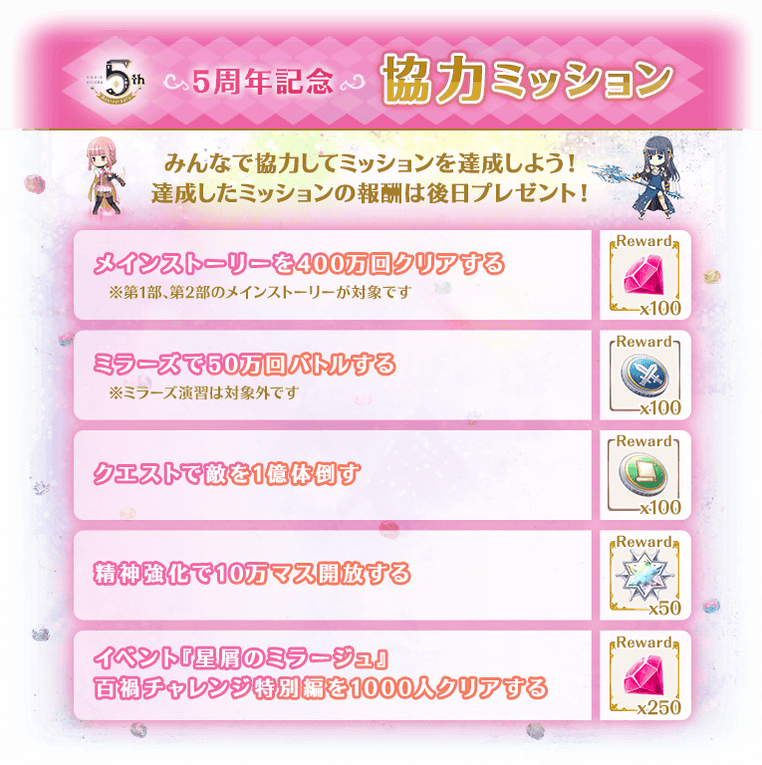 8月22日16:00より、全ユーザーのプレイ状況に応じてミッションが進行する『5周年記念協力ミッション』を開始いたしました。