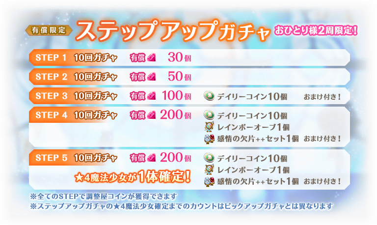 ※★4魔法少女1体までのカウントは、開催期間毎にカウントするため、次のピックアップガチャや期間限定ガチャへカウントは引き継がれません。