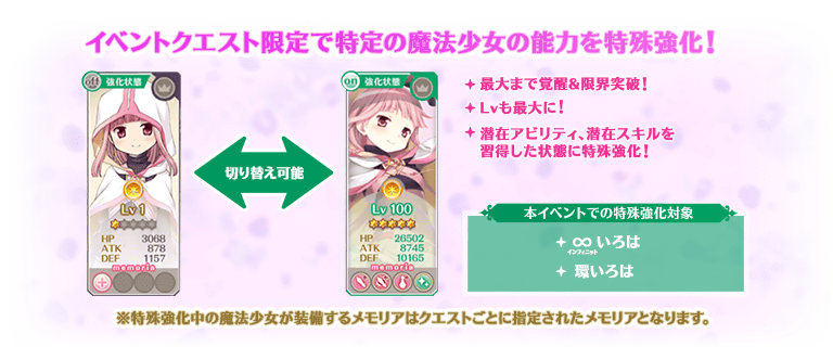 ※「ステータス特殊強化」中は、対象の魔法少女のLv・覚醒状態・マギアLv・「精神強化」の習得状態が固定となり、魔法少女の育成状態によって変化することはございません。