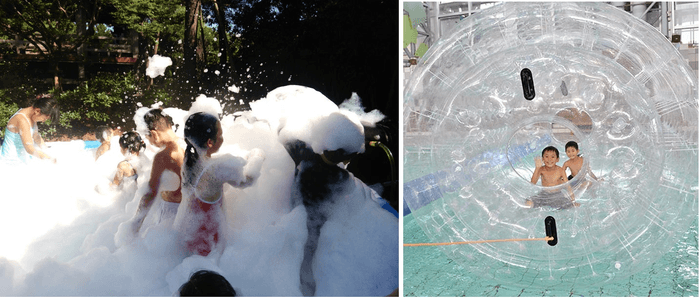 左:「平日限定 バブルプール」。ふわふわの泡にまみれて楽しもう!