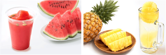 左:熱を冷ます作用があると言われるウリ科の植物・スイカ。さっぱりとした甘さのジュースでお楽しみください。(419円・税込)