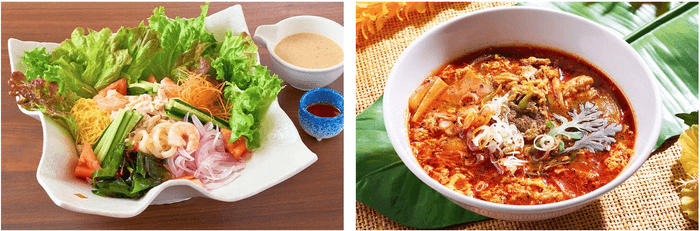 左:豆乳ベースのクリーミーなタレが麺と種類豊富な具材に絡む、和食処・千寿樓の「胡麻豆乳ピリ辛サラダうどん」(1,298円・税込)。