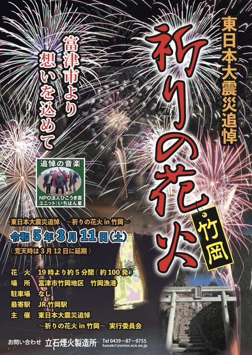 東日本大震災追悼~祈りの花火in竹岡~実行委員会は、2023年3月11日(土)に東日本大震災犠牲者の慰霊と復興への思いを込めて「東日本大震災追悼~祈りの花火in竹岡~」を開催します。追悼行事として黙祷、追悼の音楽、花火打ち上げを行います。あれから12年、今年も富津市にて追悼を捧げます。