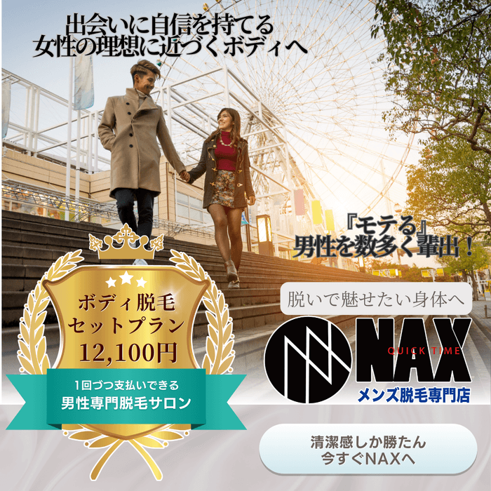 胸やお腹、背中、肩など、気になる部分を自由に選んで脱毛できるNAXの上半身セットプラン。自分に合ったケアを取り入れることで、より清潔感があり、魅力的な男性を目指せます。女性からの好感度をアップさせる第一歩として、ぜひ上半身脱毛にチャレンジしてみてください!メンズ脱毛NAXでお待ちしています。