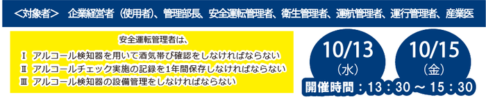 【東海電子】白ナンバー(社⽤⾞)アルコールチェック義務化対象事業者の皆様へ~道路交通法改正 アルコール検知器義務化 対策セミナー10月13日(水) 、15日(金) 開催のお知らせ~