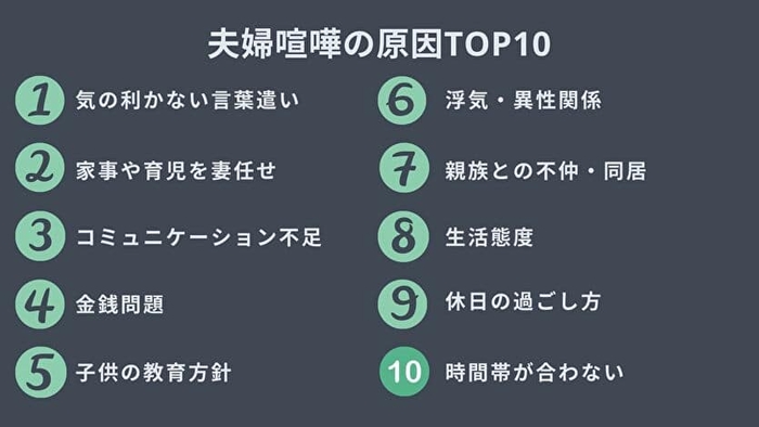 夫婦喧嘩には多くの原因があります。その中から10大原因をまとめてランキング形式でまとめました。