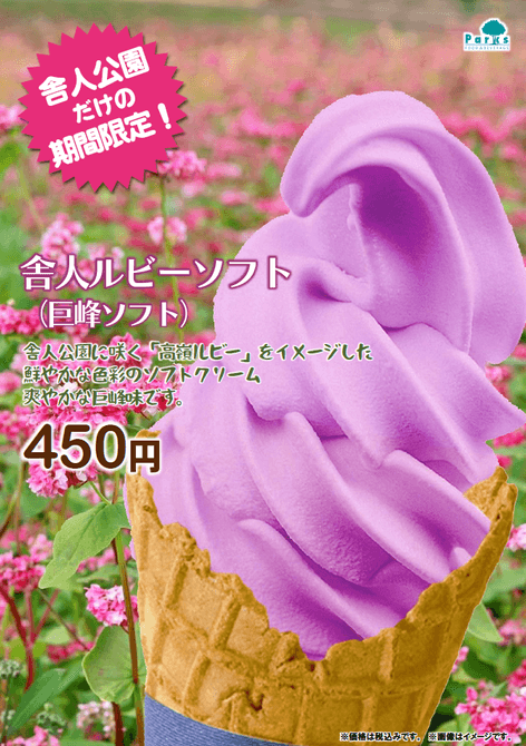 パークス夕日の丘店では、赤いそばの花「高嶺ルビー」をイメージした鮮やかな色彩のソフトクリーム「舎人ルビーソフト」も期間限定で販売中です。ぜひこの機会に舎人公園にお越しください。
